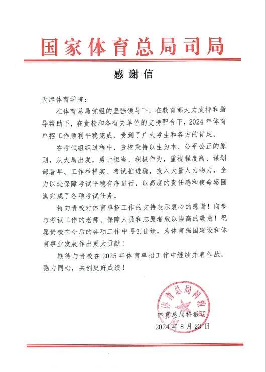 圆满完成2024年体育单招工作表示肯定和感谢。