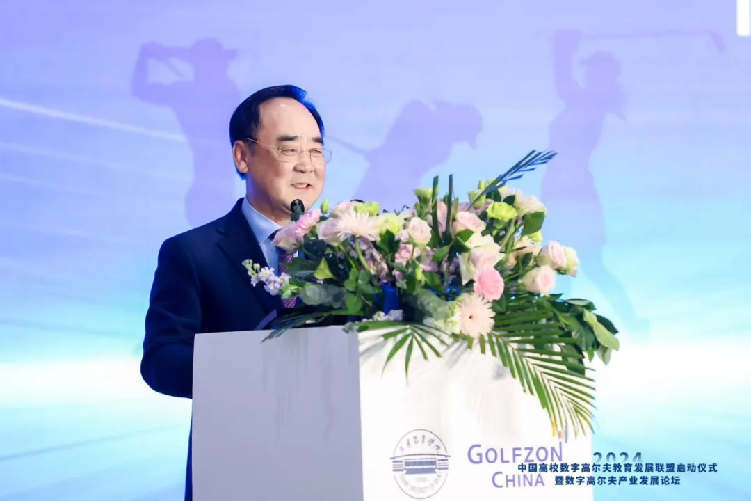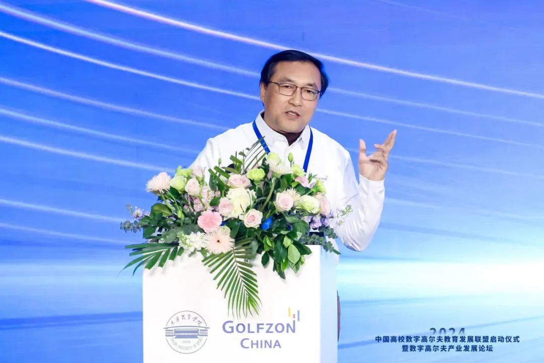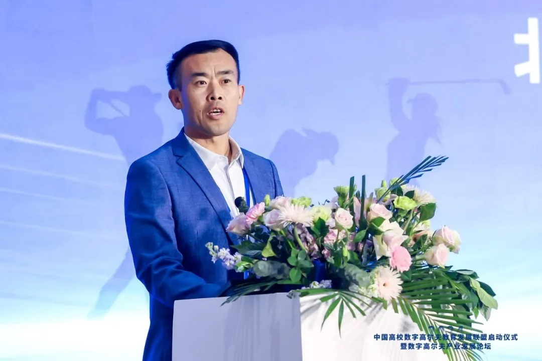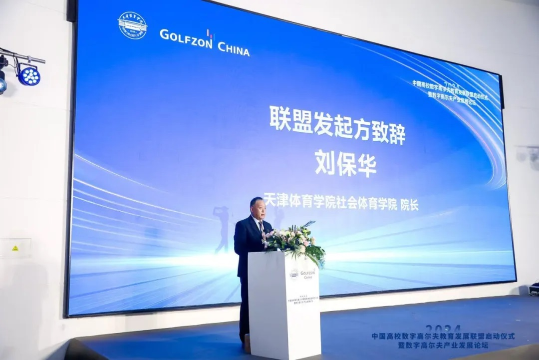 社会体育学院院长刘保华代表联盟发起方致辞。他介绍了联盟的宗旨和目标。联盟将致力于促进院校之间的学科交流、加强校企之间的资源合作,推动数字高尔夫产学研一体化发展。