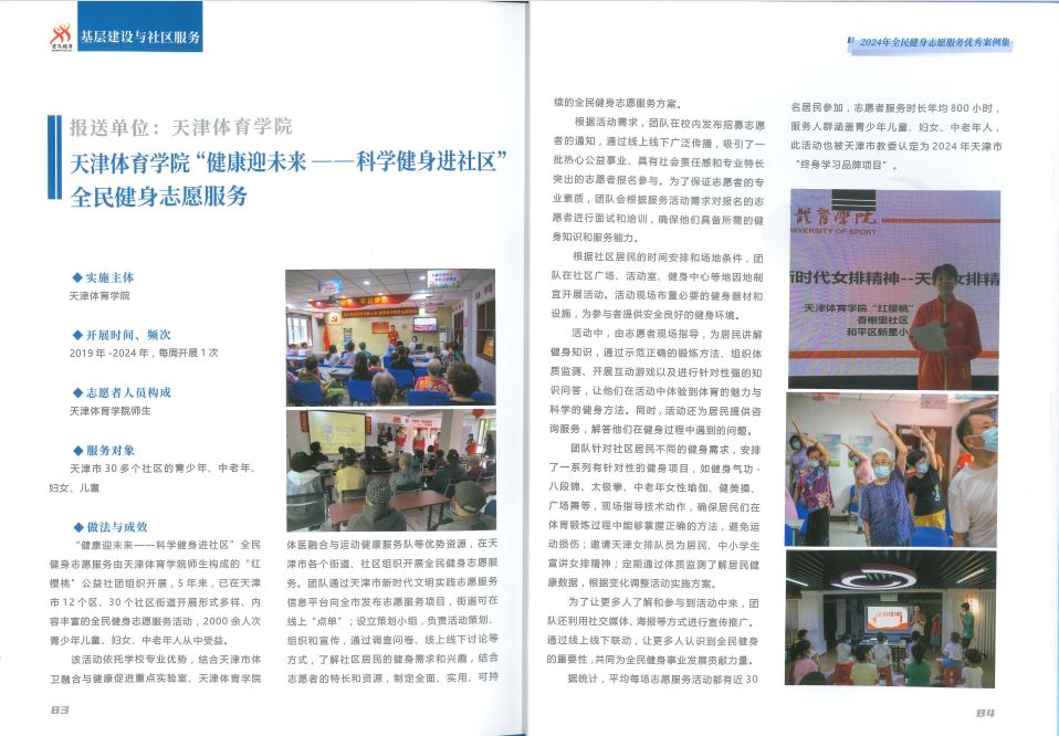 “健康迎未来——科学健身进社区”全民健身志愿服务,由学校师生志愿者组成的“红樱桃”公益社团组织开展。5年来,已在天津市12个区、30个社区街道开展女排精神宣讲、健身知识普及、体质检测,以及健身气功、中老年女性瑜伽、青少年防溺水、运动技能培训等形式多样、内容丰富的全民健身志愿服务活动,平均每场志愿服务活动均有近30名居民参加,2000余人次青少年儿童、妇女、中老年人从中受益。该项目也被天津市教委认定为2024年天津市“终身学习品牌项目”,获得2024年天津市青年志愿服务大赛优秀奖。下一步,88直播篮球